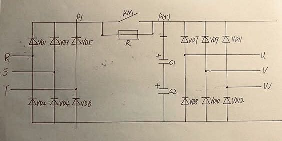 VD1~VD6为输入三相整流电路,R为充电电阻,KM为充电接触器。C1、C2为串联储能电容。VD7~VD12为三相逆变电路中6只二极管。IGBT除非在漏电和短路状态能没出电阻变化,对逆变输出电路我们能实际测出的只是6只二极管的正、反电阻值。这样一来,整个驱动器主电路的输入整流和输出逆变电路,相当于两个三相桥式整流电路。