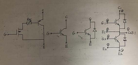 以上说到对端子电阻的测量只是大致判定IGBT的好坏,尚不能最后认定IGBT就是好的,简易测量后,就对客户说,输出模块是好的,会给自己带来极大的被动,IGBT的好坏还需进一步测量验证。如何检测IGBT的好坏,得首先从IGBT的结构原理入手,找到相应有效的测量方法,如图所以为IGBT等效电路和单、双管模块引脚图。