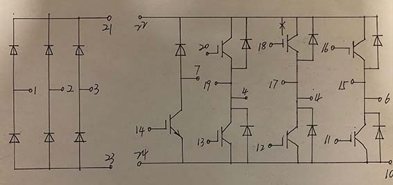 整流电路中VD2、VD4、VD6及U、V、W端子对P(+)、N(-)端子之间的测量,也只能通过测量内部二极管的正反向电阻的情况来大致判定IGBT的好坏。